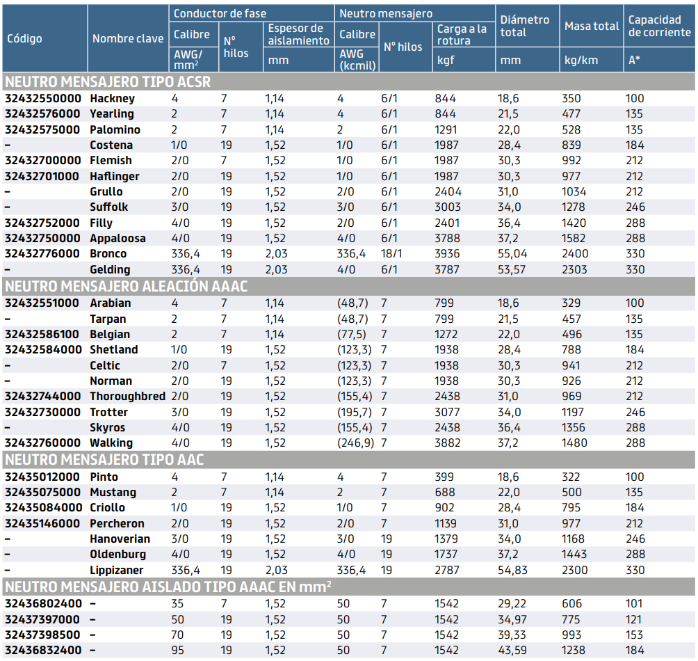 - Cable formado por tres conductores de Aluminio 1350 H19 aislados con XLPE-SR. Van cableados alrededor del neutro mensajero ACSR, AAC o AAAC el cual puede ser desnudo o aislado con XLPE-SR.